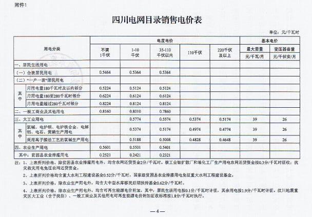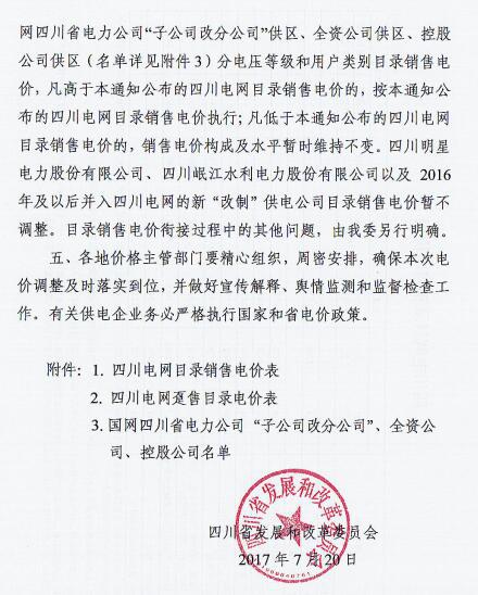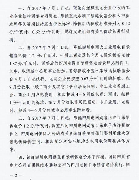 近日,四川省發(fā) 改 委發(fā)布了《四川省發(fā)展和改革委員會關于降低四川電網目錄銷售電價合理調整電價結構有關事項的通知》(以下簡稱“通知”)。通知指出,自2017年7月1日起,取消向燃煤發(fā)電企業(yè)征收工業(yè)企業(yè)結構調整專項資金,降低重大水利工程建設基金和中大型水庫移民后期扶持基金征收標準,降低后的征收標準分別為0.52分/千瓦時、0.62分/千瓦時。燃煤發(fā)電機組有關電價政策另行明確。具體情況如下: