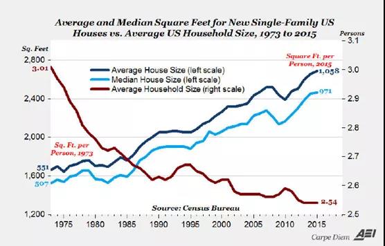 當(dāng)然了,國內(nèi)家庭各種家用電器也不少,怎么會(huì)跟美利堅(jiān)老百姓有這么大的差距呢?首先我們的城市化水平還不如美國,還有幾億人住在農(nóng)村。其次美國的人均住房面積大,比歐洲和中國都大不少,會(huì)帶來對(duì)空調(diào),燈具和其他家電的使用也更為奢侈,下圖是美國的2015年新建的獨(dú)棟房屋的人均住房面積達(dá)到了1038平方英尺,超過96平米了,注意這可是人均啊,怪不得國內(nèi)中產(chǎn)和土豪都喜歡去北美買大house。