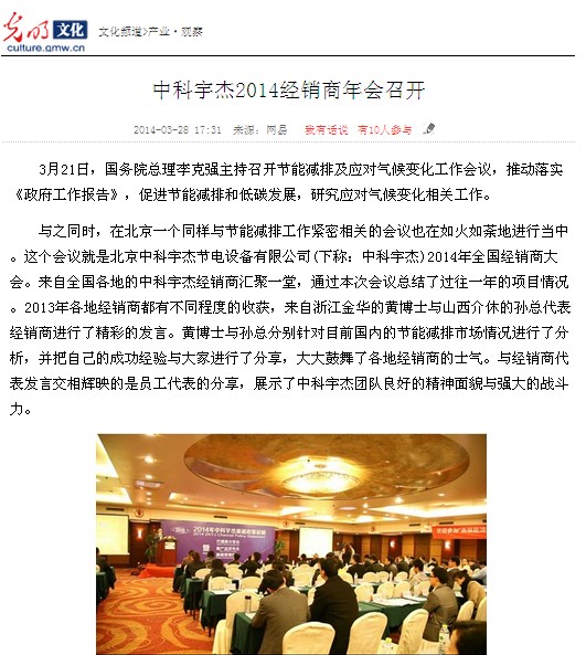 與之同時,在北京一個同樣與節(jié)能減排工作緊密相關(guān)的會議也在如火如荼地進行當中。這個會議就是北京中科宇杰節(jié)電設(shè)備有限公司(下稱:中科宇 杰)2014年全國經(jīng)銷商大會。來自全國各地的中科宇杰經(jīng)銷商匯聚一堂,通過本次會議總結(jié)了過往一年的項目情況。2013年各地經(jīng)銷商都有不同程度的收 獲,來自浙江金華的黃博士與山西介休的孫總代表經(jīng)銷商進行了精彩的發(fā)言。黃博士與孫總分別針對目前國內(nèi)的節(jié)能減排市場情況進行了分析,并把自己的成功經(jīng)驗 與大家進行了分享,大大鼓舞了各地經(jīng)銷商的士氣。與經(jīng)銷商代表發(fā)言交相輝映的是員工代表的分享,展示了中科宇杰團隊良好的精神面貌與強大的戰(zhàn)斗力。