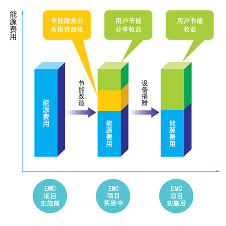 專業(yè)化的能源服務公司 (Energy Management Company 簡稱 EMC) 與愿意進行節(jié)能改造的客戶簽訂節(jié)能服務合同,按照合同采用先進的節(jié)能技術(shù)及全新的服務機制來為客戶實施節(jié)能項目。
